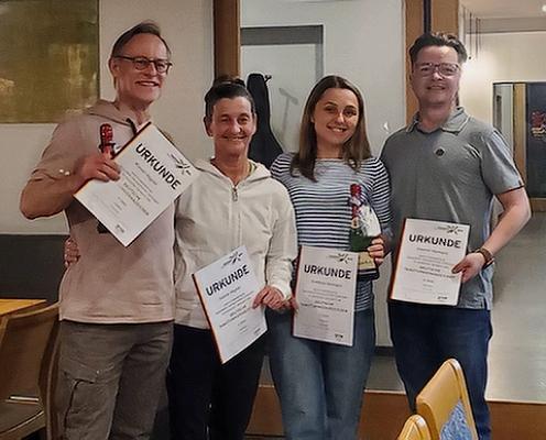 Das Resümee aus sportlicher Sicht zog wieder Sportwart Jürgen Kosch. Mit insgesamt 80 Turnierteilnahmen und davon 46 Medaillenplätzen sowie drei Aufstiegen in die nächsthöhere Leistungsklasse haben die Turnierpaare wieder eine eindrucksvolle Bilanz hinterlassen. Besonders hervorzuheben sind die Leistungen Ronald und Sabine Hegner (Mas III B) sowie Dietrich und Svetlana Hermann (Mas II B), die für das Erreichen von jeweils 25 Medaillenplätzen in ihrer gesamten Turnierlaufbahn mit dem Deutschen Tanzturnierabzeichen in Silber geehrt wurden. Neben der Erwähnung der großartigen Erfolge der ATC-Turniertanzpaare gab es diesmal auch kritische Töne in Richtung des Verbands, der durch kurzfristige Termin-Umplanungen der Ranglistenturniere maßgeblich zum wirtschaftlichen Misserfolg des Bodenseetanzfestes 2024 beigetragen hatte.